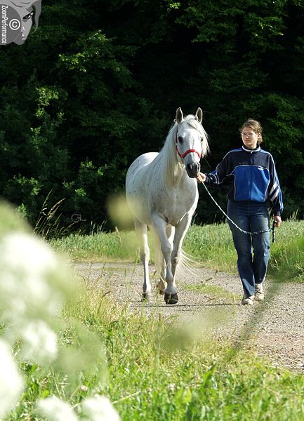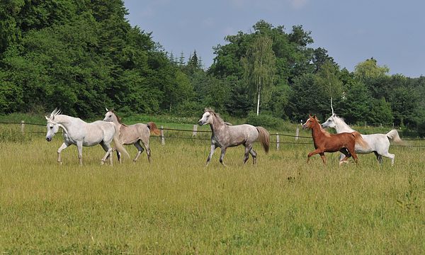 Our youngsters grow up in a herd, running and playing on the pasture as much as possible. So they have all the social contact and freedom they need to develop a good character and a sound condition. In addition to this it is important to us to spend much time with our Arabians each day and take care of them intensively. For this reason we generally don't have more than ten horses. In our view this daily contact is what especially Arabian horses deservedly expect from their owners and what makes our horses so well behaved and paying so much friendly attention to humans. We start to train our horses at the age of three, first by lunging them and by work at hand. At the age of four years they are started under saddle and then constantly trained to higher levels.
